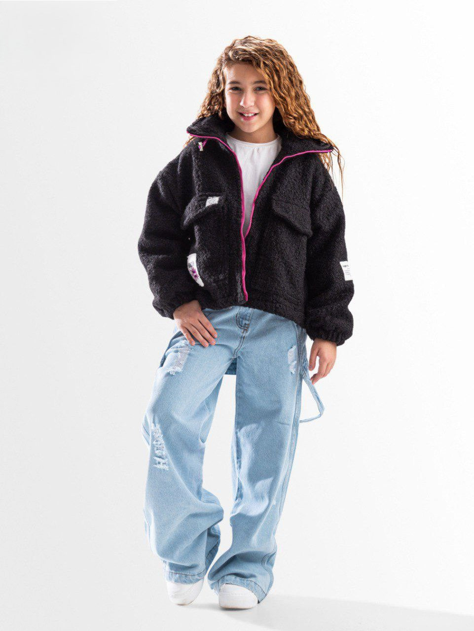 This black teddy jacket comes in a soft, fluffy texture with bright pink zipper details for a fun pop of color. Featuring a relaxed fit, high collar, and practical pockets, it’s the perfect blend of comfort and trendy style.